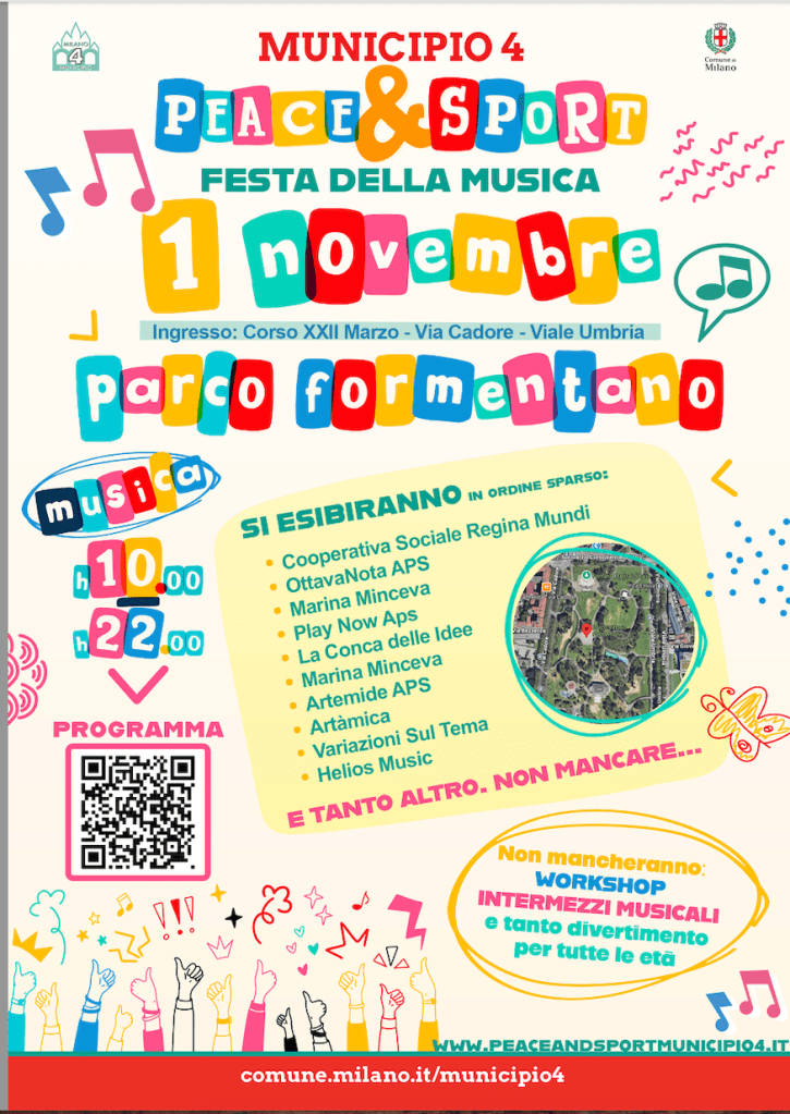 Dopo la partecipazione alla festa del Municipio 4, vi invitiamo a partecipare alla festa della musica, organizzata dal Municipio 4, che si terrà il giorno 1 Novembre al Parco Formentano, a cui noi saremo presenti come ospiti dal pomeriggio, a partire dalle 15:30. Presumibilmente, dalle 17:15 circa per massimo 45 minuti, ci saranno le esibizioni di alcuni nostri allievi e della band i quali, in base ad una serie di criteri e disponibilità, rappresenteranno l’intera Play Now sul palco, nel tempo che ci è stato dato a disposizione. Non potete mancare, vi aspettiamo numerosi!